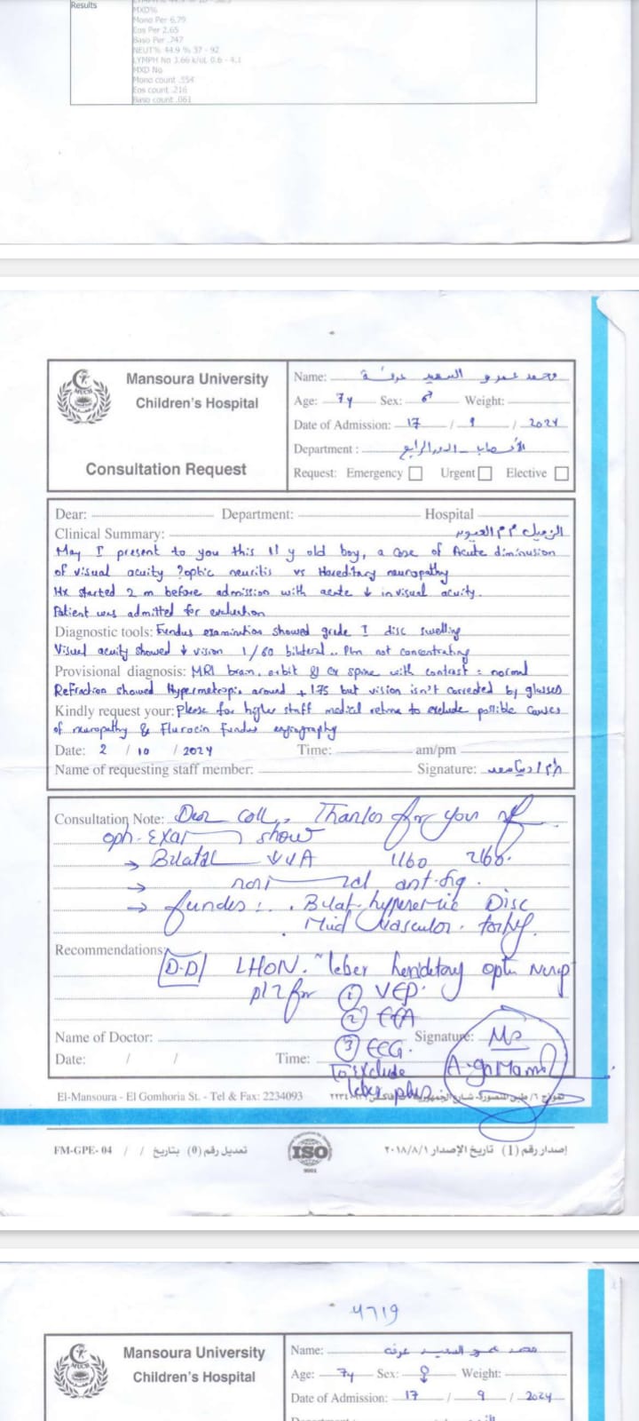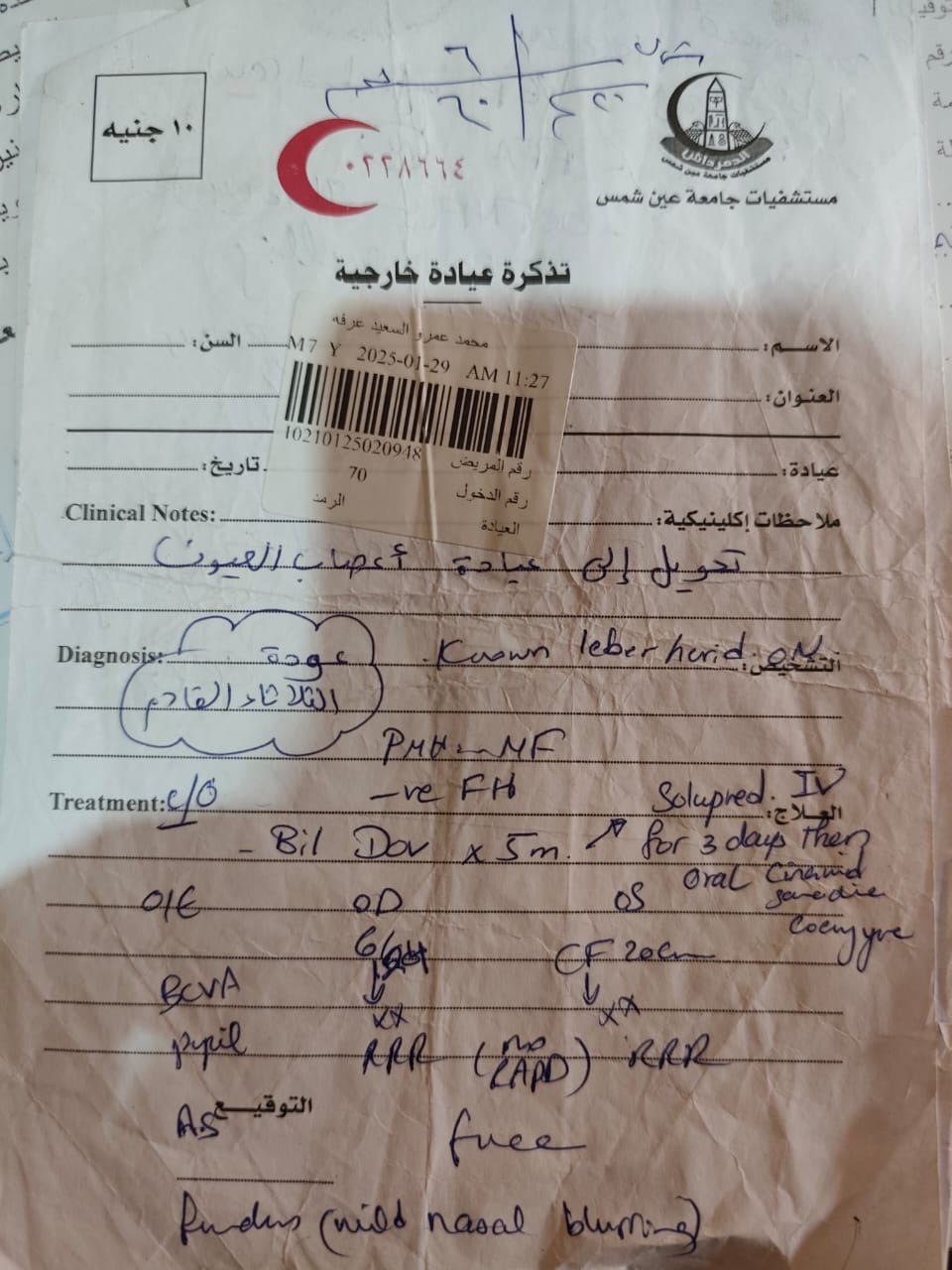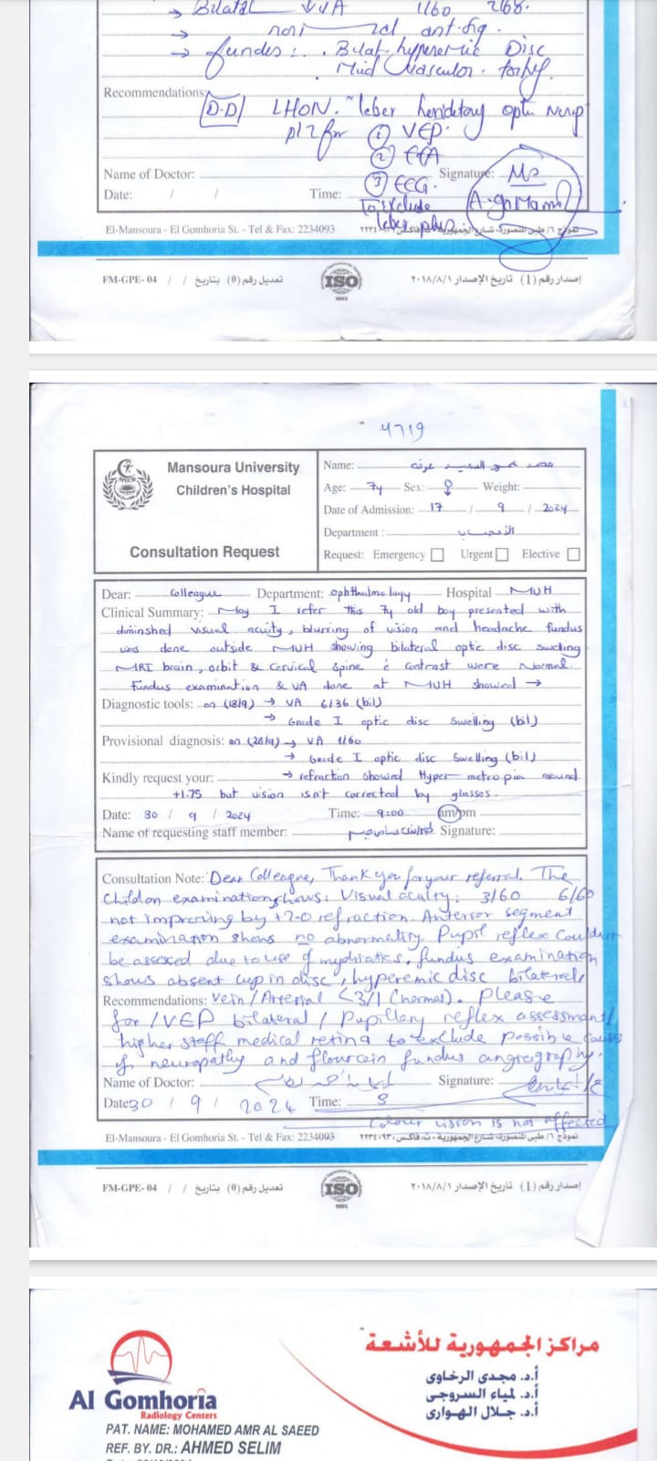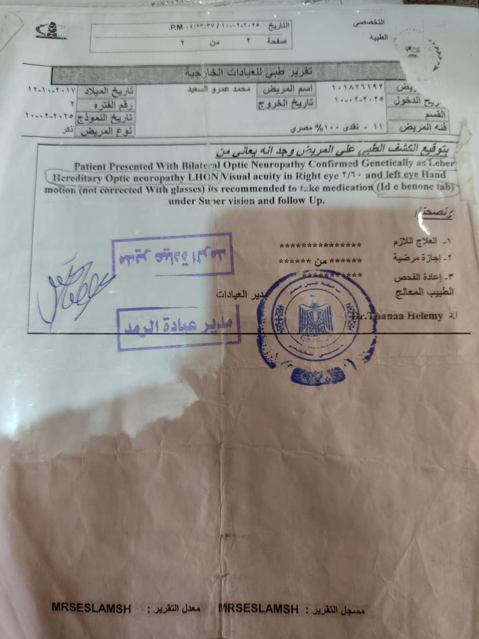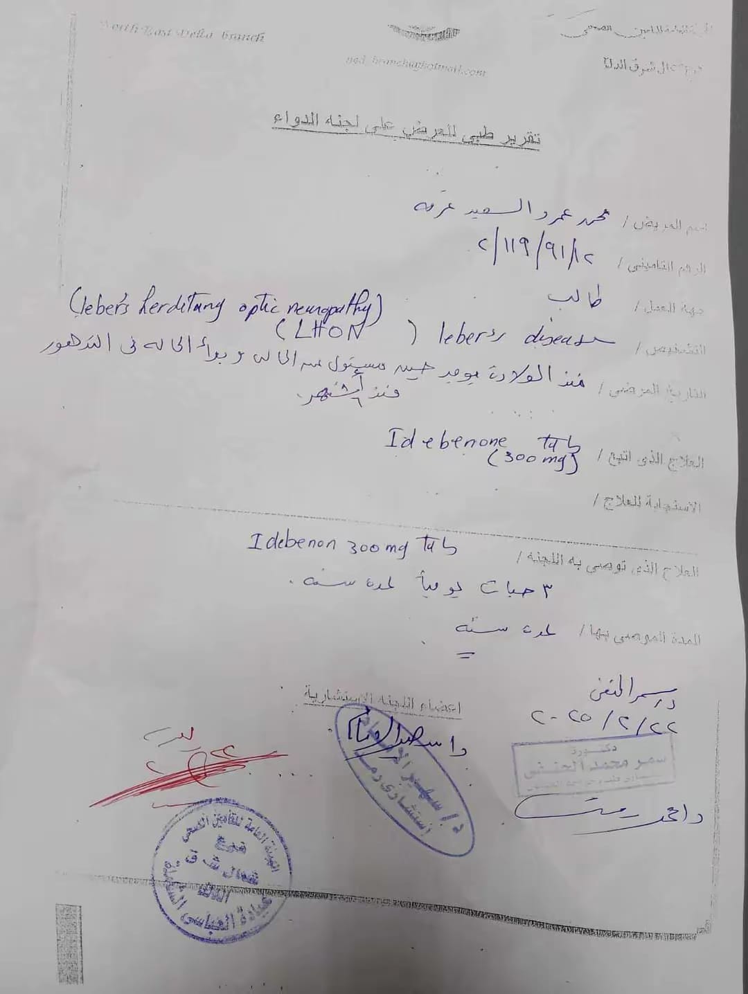 وبناءا على ما كشفته التقارير الطبية للطفل محمد عمرو الذى يبلغ من العمر ٨ سنوات حدة أبصار العين اليمنى ٣/ ٦٠ ولا تتحسن بالنظارة وحدة أبصار العين اليسرى ترى خيال ولا تتحسن بالنظارة ويعانى أيضا من ضمور بالغصب البصري فى العينين بسبب مرض( ليبر ) ورسم العصب البصري متاثر بذلك الضمور ويحتاج إلى العلاج بدواء ( ابيدينون ) لتحسين النظر.