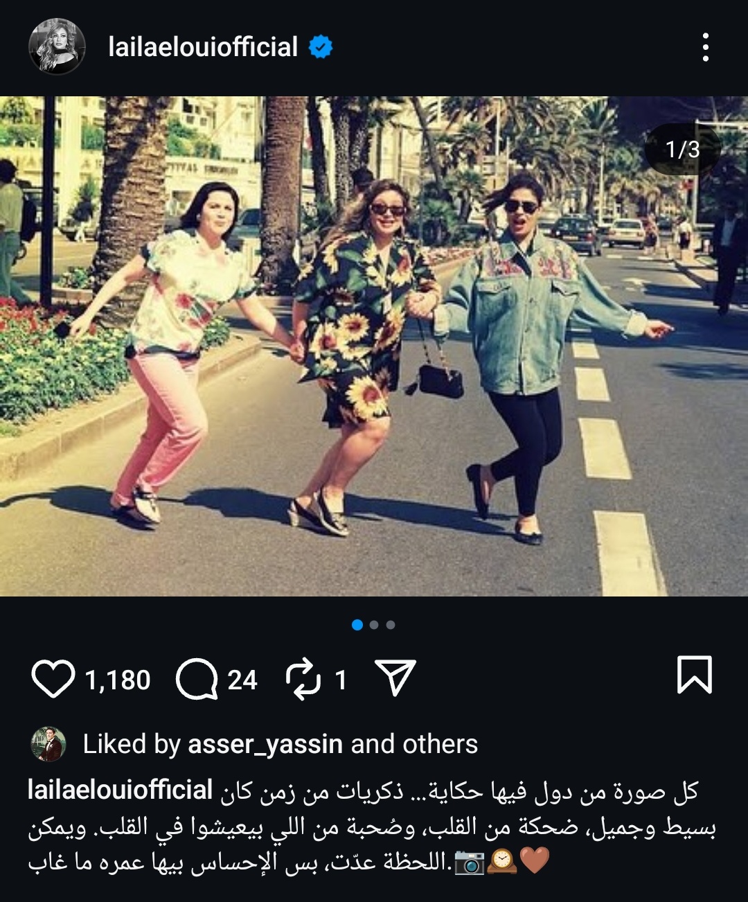 وكتبت عبر حسابها الرسمي على موقع التواصل الاجتماعي لتبادل الصور والفيديوهات الانستجرام: "كل صورة من دول فيها حكاية ... ذكريات من زمن كان بسيط وجميل، ضحكة من القلب، وصحبة من اللي بيعيشوا في القلب، ويمكن اللحظة عدّت، بس الإحساس بيها عمره ما غاب".