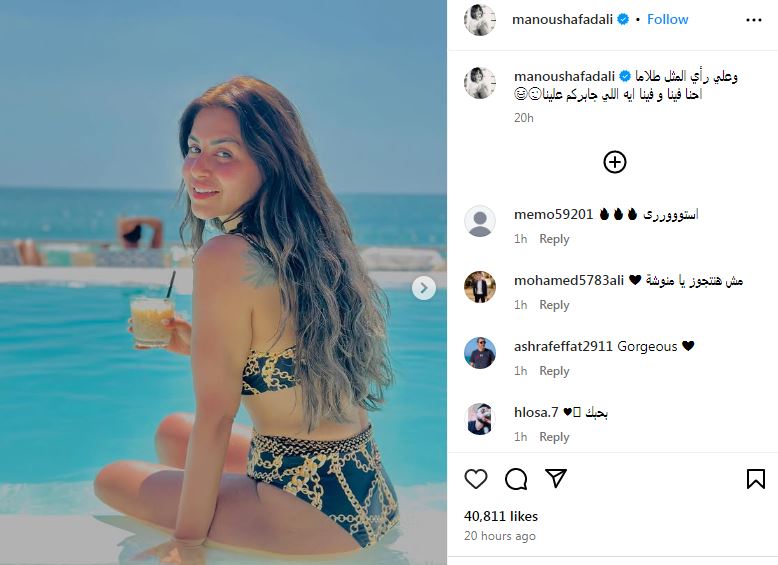شاركت الفنانة منة فضالي متابعيها صور جديدة من أحدث ظهور لها أثناء عطلتها الصيفية وارتدت في الصور لوك صيفي ملفت وجذاب حيث ظهرت بمايوه أبرز جمالها بالأسود والذهبي.