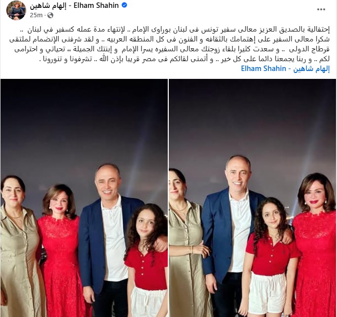 وكتبت عبر حسابها على مواقع التواصل الاجتماعي الفيسبوك: "إحتفالية بالصديق العزيز معالى سفير تونس فى لبنان بوراوى الإمام .. لإنتهاء مدة عمله كسفير في لبنان .. شكرا معالى السفير على إهتمامك بالثقافه والفنون فى كل المنطقه العربيه.. ولقد شرفنى الإنضمام لملتقى قرطاج الدولى .. وسعدت كثيرا بلقاء زوجتك معالى السفيره يسرا الإمام وإبنتك الجميلة، تحياتي واحترامى لكم .. وربنا يجمعنا دائما على كل خير .. و أتمنى لقائكم فى مصر قريبا بإذن الله .. تشرفونا وتنورونا".