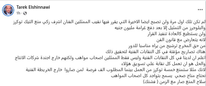 وكتب عبر حسابه الرسمي على موقع التواصل الإجتماعي الفيسبوك: "لم تكن تلك اول مرة ولن تصبح ايضا الاخيرة التي يقرر فيها نقيب الممثلين الفنان اشرف زكي منع التيك توكرز والبلوجرز من التمثيل إلا بعد دفع غرامة مليون جنيه، ولن يستطيع كالعادة تنفيذ القرار، لانه يتعارض مع قانون الفن".