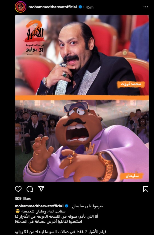 ونشر ثروت عبر حسابه الرسمي على موقع التواصل الاجتماعي لتبادل الصور والفيديوهات الانستجرام، وعلق: "تعرفوا على سليمان... ستايل، ثقة، ومليان شخصية أنا اللي بأدي صوته في النسخة العربية من الأشرار 2! استعدوا تقابلوا أشرس عصابة في المدينة".