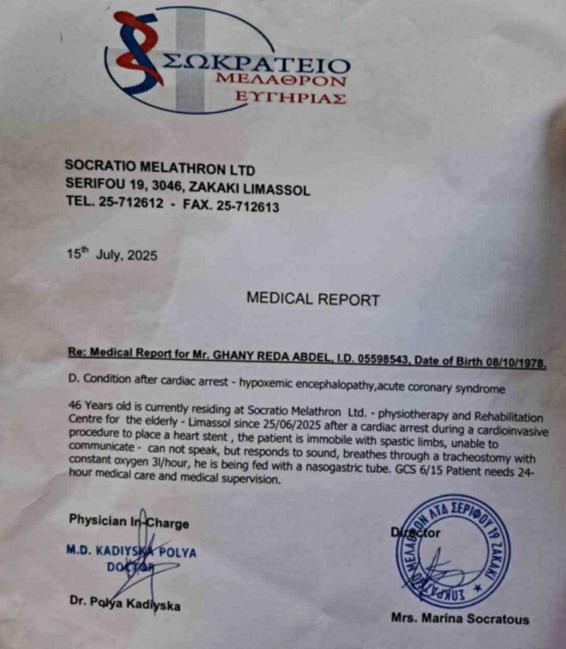 أوضح الأطباء المعالجون في قبرص أن حالة "رضا" الصحية تحتاج إلى نقله إلى مصر للعلاج بشكل عاجل، حيث لم يعد التأمين الصحي الخاص به يغطي تكاليف العلاج، وهو ما يفاقم من معاناته ومعاناة أسرته.