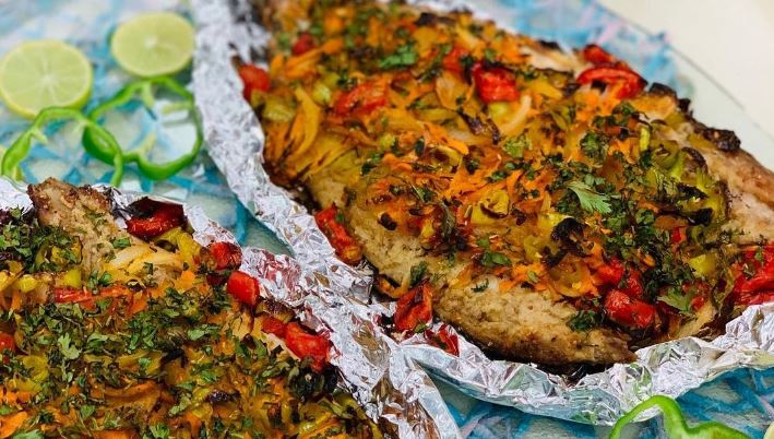 نُحضر صينية ونفرد بها الورق الفويل ويفرد السمك بها، ويوضع عليها خليط الخضروات.