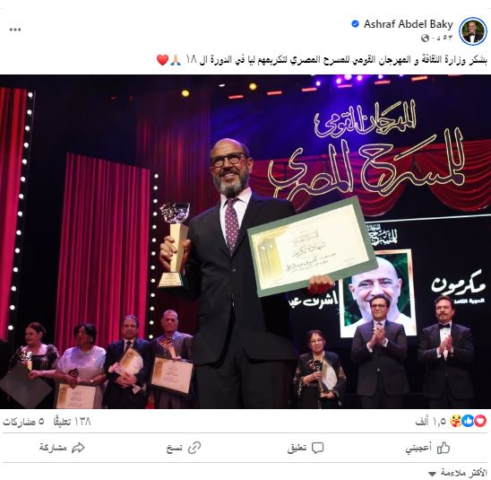 وكتب أشرف عبد الباقي عبر صفحته الرسمية "فيس بوك" " بشكر وزارة الثقافة و المهرجان القومي للمسرح المصري لتكريمهم ليا في الدورة ال ١٨".