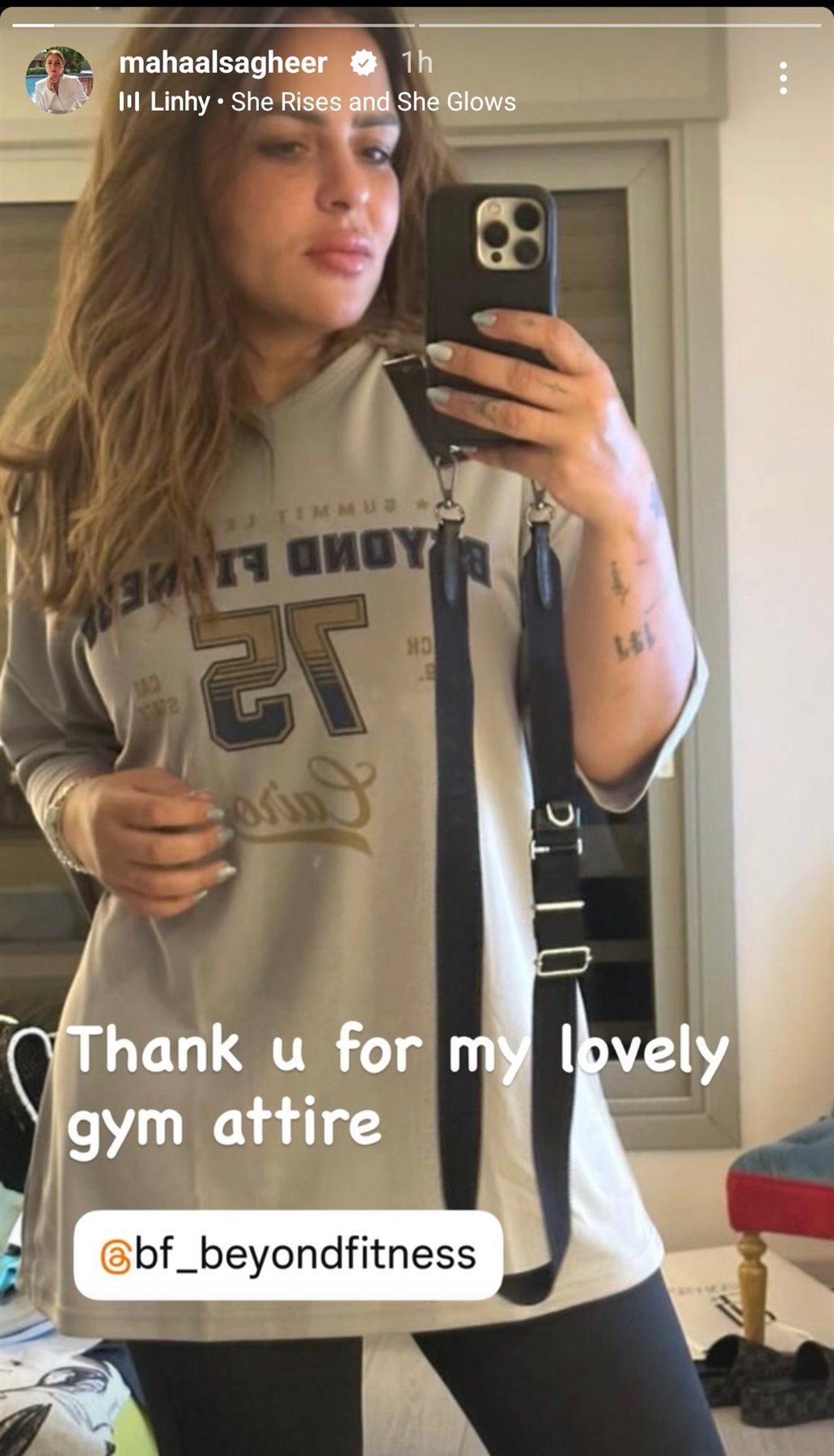 وعلقت مها الصغير عبر حسابها الرسمي على موقع التواصل الاجتماعي لتبادل الصور والفيديوهات الانستجرام: "شكرا لك على ملابس الصالة الرياضية الجميلة".