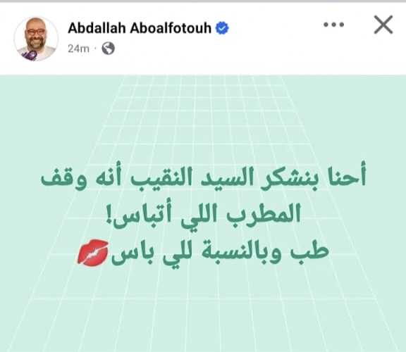 وكتب عبر حسابه الرسمي على موقع التواصل الاجتماعي الفيسبوك: أحنا بنشكر السيد النقيب أنه وقف المطرب اللي أتباس! طب وبالنسبة للي باس.