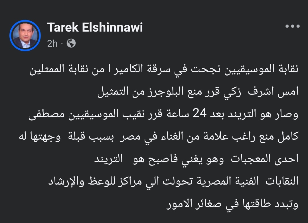 وكتب عبر حسابه الرسمي على موقع التواصل الاجتماعي لتبادل الصور والفيديوهات الانستجرام: نقابة الموسيقيين نجحت في سرقة الكاميرا من نقابة الممثلين، امس اشرف زكي قرر منع البلوجرز من التمثيل.