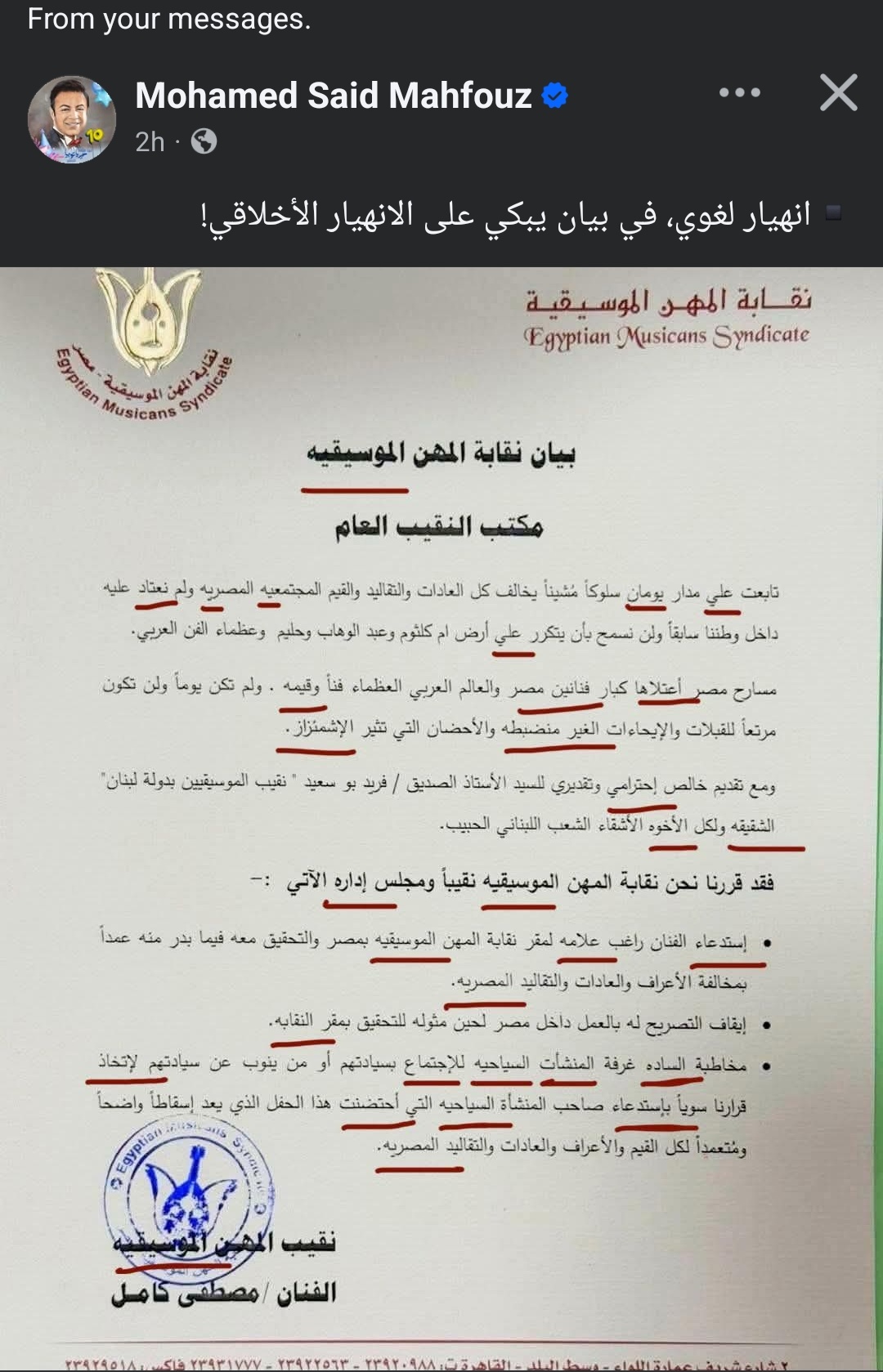 وأضاف مع تقديم خالص إحترامي وتقديري للسيد الأستاذ الصديق فريد بو سعيد نقيب الموسيقيين بدولة لبنان الشقيقة ولكل الأخوه الأشقاء الشعب اللبناني الحبيب فقد قررنا نحن نقابة المهن الموسيقية نقيباً ومجلس إدارة الآتي :