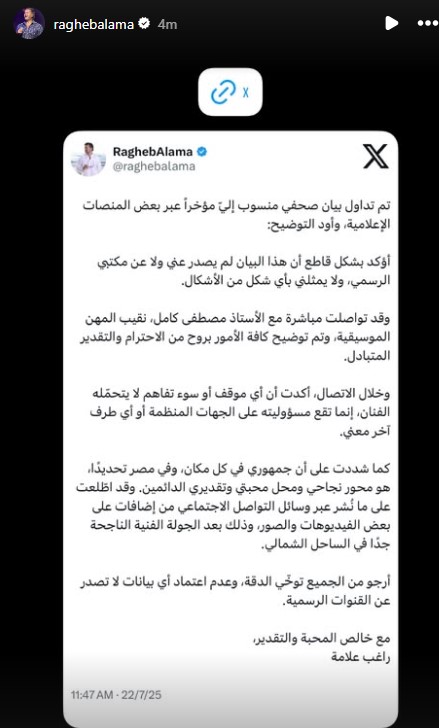 أرجو من الجميع توخي الدقة، وعدم اعتماد أي بيانات لا تصدر عن القنوات الرسمية، مع خالص المحبة والتقدير راغب علامة.