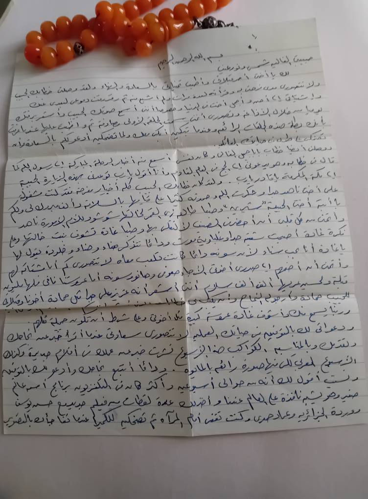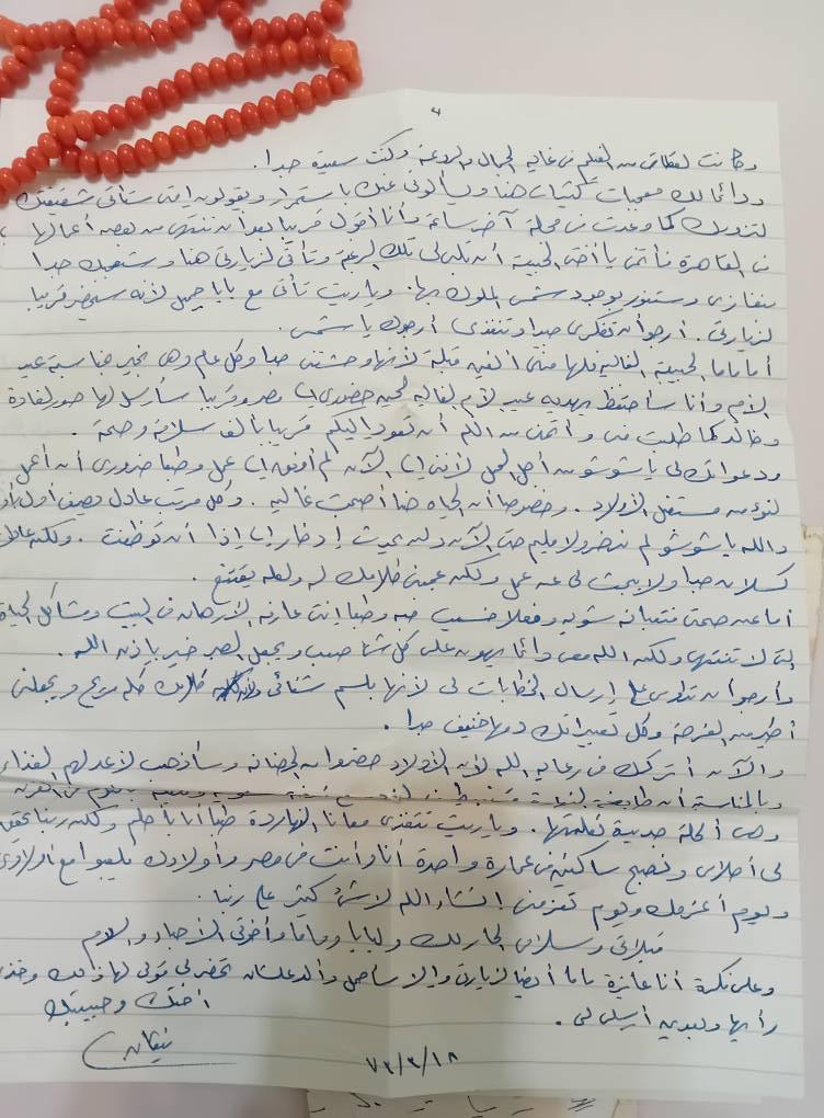 واختتمت بكلمات مؤثرة: "ووصل لها ثواب ما أديته لها فريضة الحج يعلم الله مكانتها في قلبي وروحى واذكر أنها من علمتنى قرأة عدية سورة ياسين وكانت احاديثنا واسرارنا نحكيها معا عندما أظهرت هذآ الخطاب لابنتي ناريمان بعد وفاة شريك عمرى حبيبي تفاجأت وفرحت كيف احتفظ به حتي الآن * أنا بالنسبه لى المعانى الروحية والذكريات والمشاعر تفوق أى ماديات وهذا ما اتصف به وكان حبيبي وروحي يتعجب ويعجب بأن الماده عندى لاتشغل آى حيز في تفكيري وان وجدانى هو فقط ما أحيا واتعامل به فى هذه الحياة الدنيا".