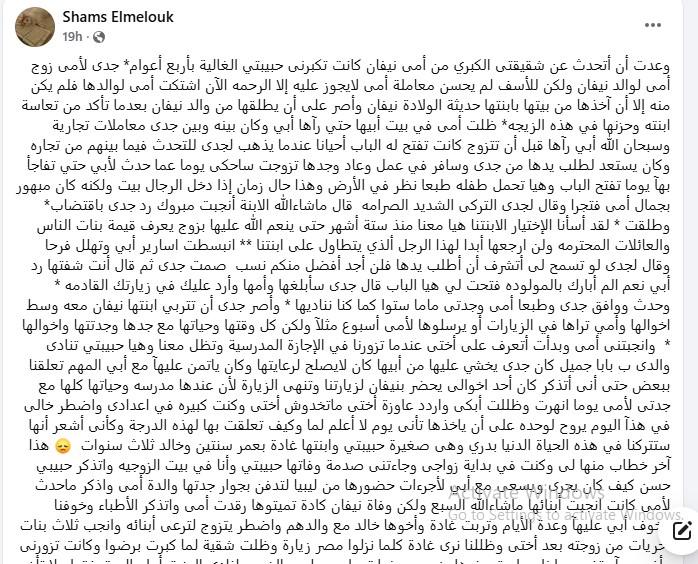 وكتبت عبر حسابها الرسمي على موقع التواصل الاجتماعي الفيسبوك: "وعدت أن أتحدث عن شقيقتي الكبري من أمى نيفان كانت تكبرنى حبيبتي الغالية بأربع أعوام جدى لأمى زوج أمى لوالد نيفان ولكن للأسف لم يحسن معاملة أمي لا يجوز عليه إلا الرحمه الآن اشتكت أمى لوالدها".
