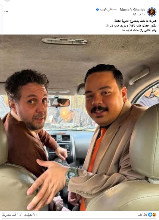حرص الفنان مصطفي غريب على توجيه رسالة طريفة ودعم لطلاب الثانوية العامة وذلك بعد ظهور النتيجة أمس الثلاثاء ونشر صورة له مع الفنان هشام ماجد من كواليس مسلسل"أشغال شقة جدا" وعلق عليها " عمرها ما كانت بمجموع الثانوية العامة، دكتور حمدي جاب 98% وعربي جاب 52 %، وهم الإتنين زي مانت شايف كدا".