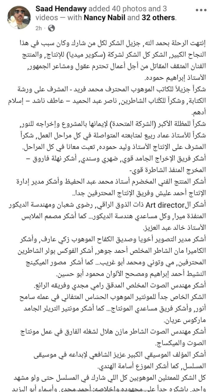 وأضاف: "أشكر فريق الإخراج الجامد قوي، ضهري وسندي، أشكر نهلة فاروق – المخرج المنفذ الشاطرة قوي- أشكر المنتج الفني المخضرم أستاذ محمد عبد الحفيظ وأشكر مدير إدارة الإنتاج أحمد عليش وفريق الإنتاج المحترفين جدا".