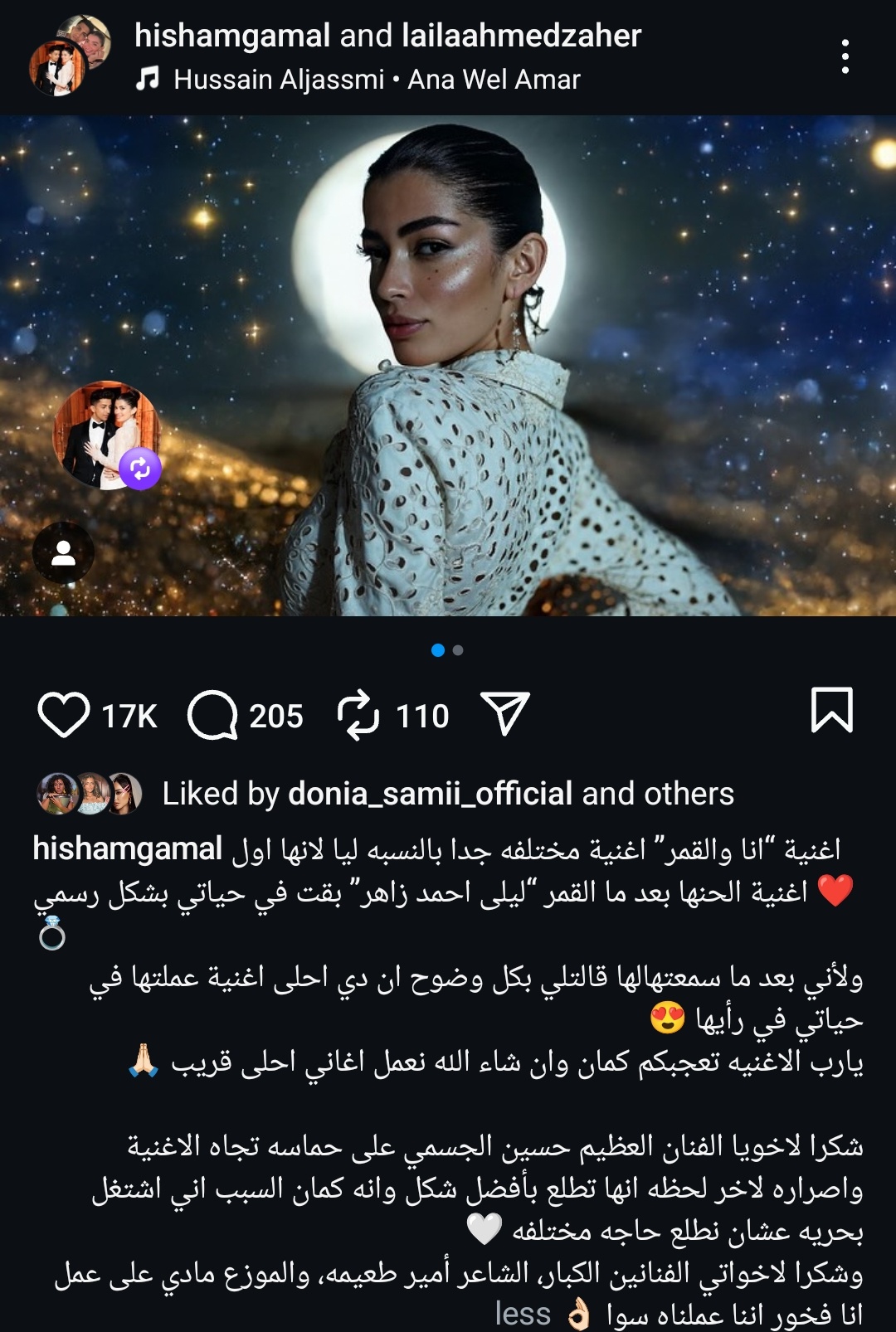وكتب عبر حسابه الرسمي على موقع التواصل الاجتماعي لتبادل الصور والفيديوهات الانستجرام: اغنية "انا والقمر" اغنية مختلفه جدا بالنسبه ليا لانها اول اغنية الحنها بعد ما القمر "ليلى" احمد زاهر بقت في حياتي بشكل رسمي.
