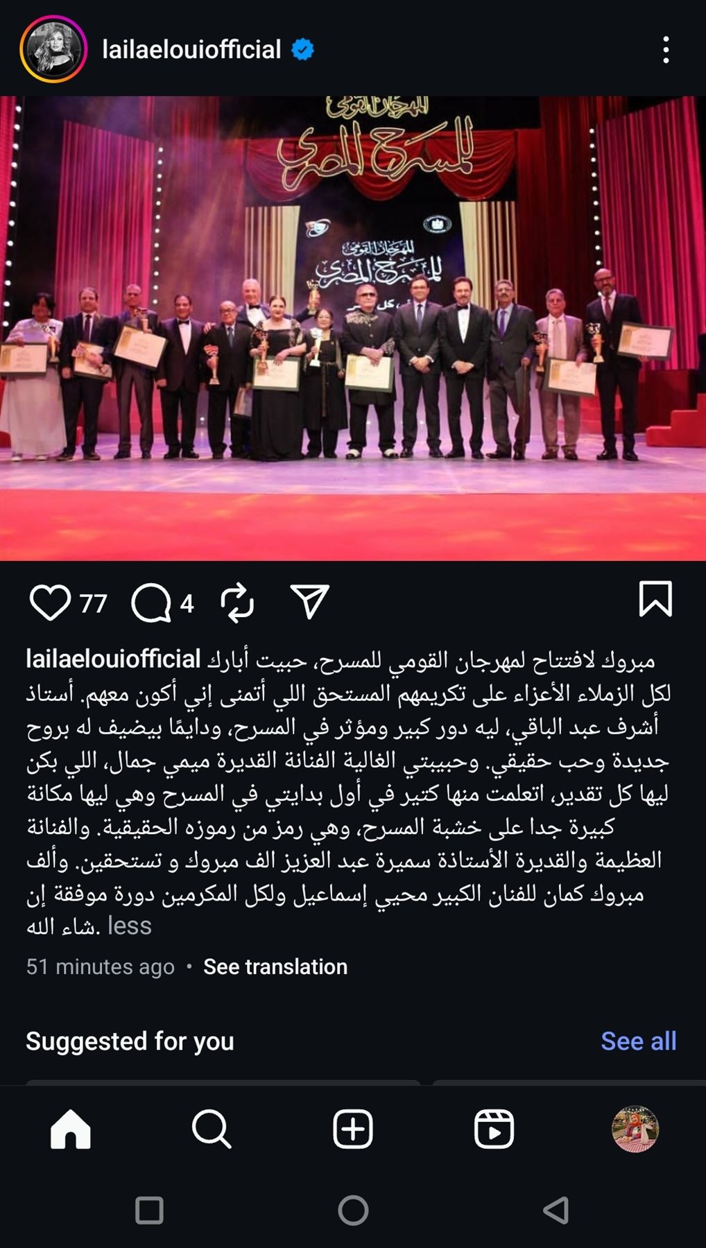 وكتبت ليلى علوي عبر حسابها الرسمي: "مبروك لافتتاح المهرجان القومي للمسرح، حبيت أبارك لكل الزملاء الأعزاء على تكريمهم المستحق اللي أتمنى إني أكون معهم".