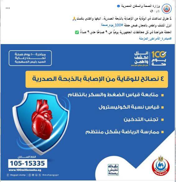 وزارة الصحة تقدم نصائح هامة للوقاية من الإصابة بالذبحة الصدرية