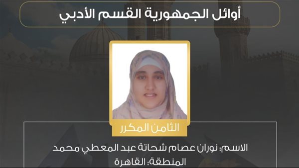 حصلت نوران عصام شحاتة عبد المعطى محمد على المركز الثامن مكرر على مستوى الجمهورية ضمن قائمة أوائل الثانوية الأزهرية 2025، في القسم الأدبي بمجموع 576 درجة بنسبة 97.6%.
