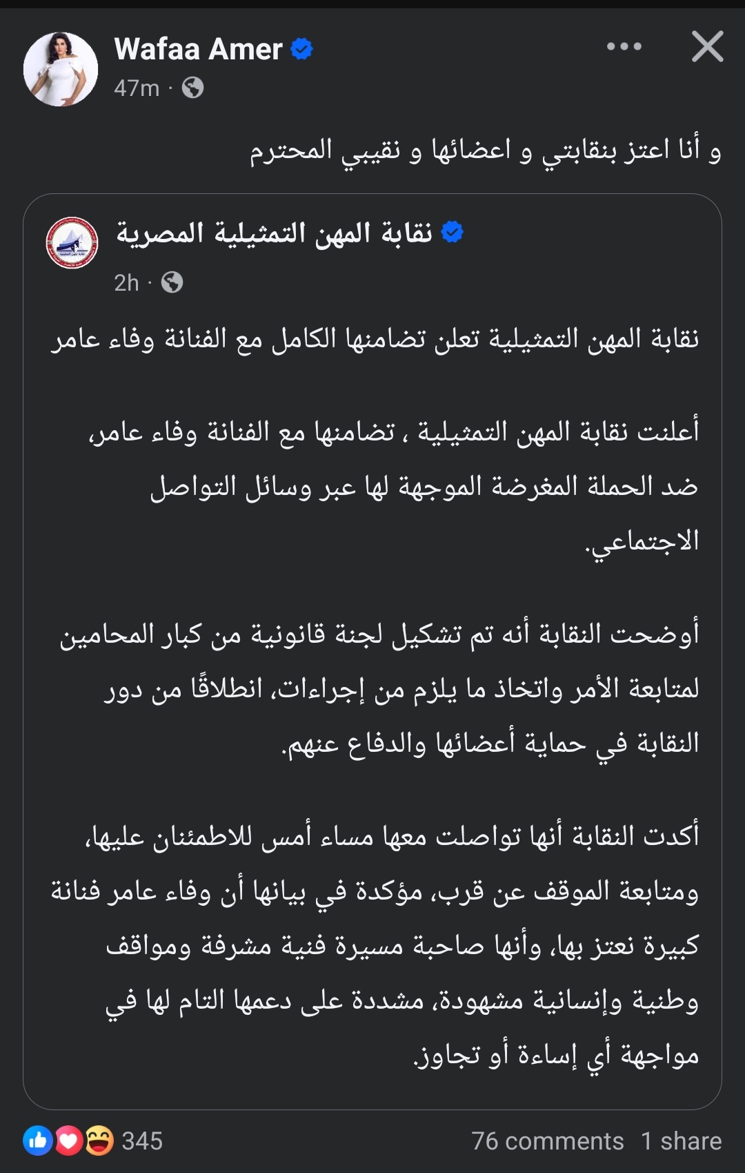 وكتبت عبر حسابها الرسمي على موقع التواصل الاجتماعي الفيسبوك: وأنا اعتز بنقابتي وأعضائها ونقيبي المحترم.
