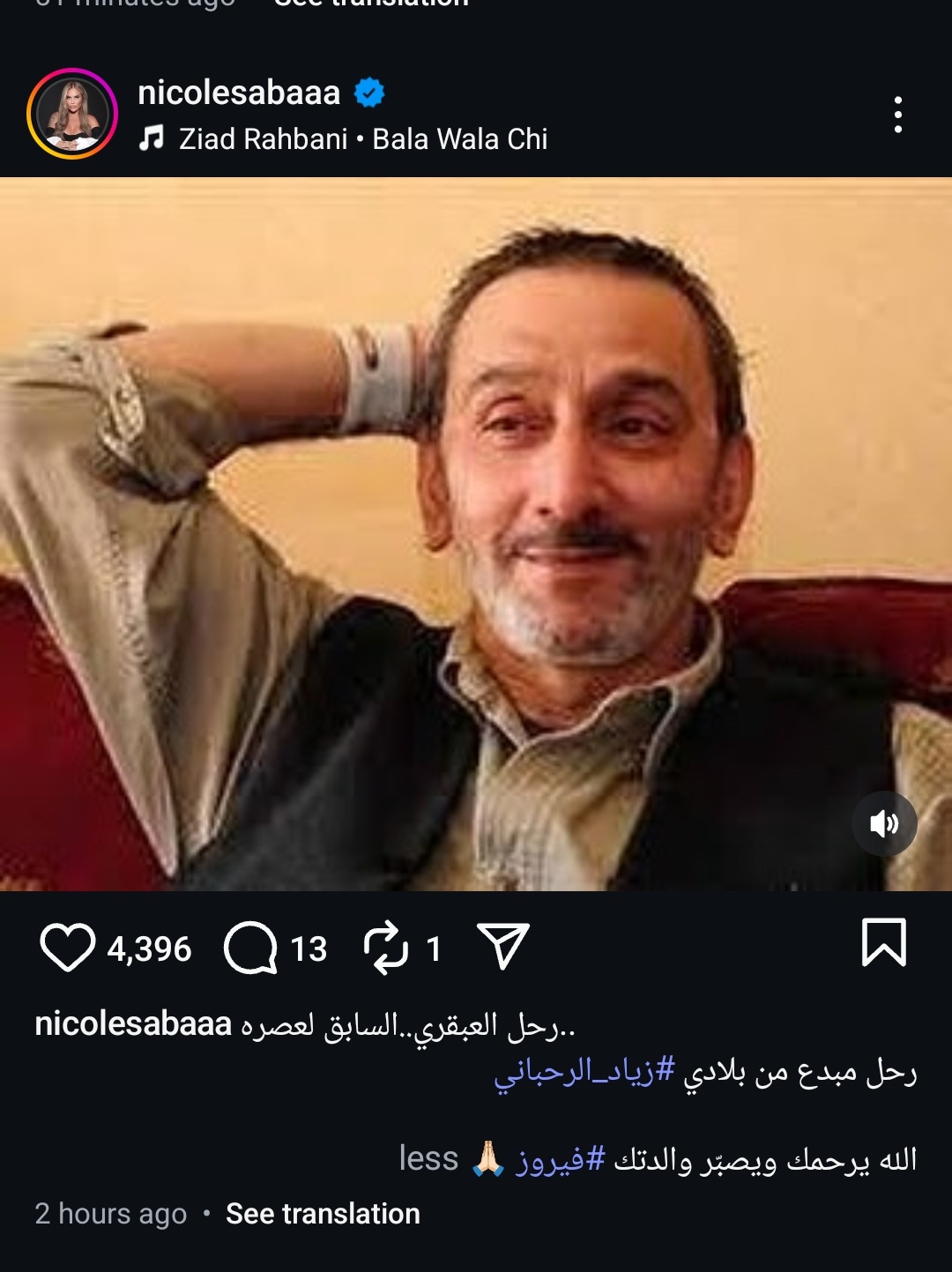 وكتبت عبر حسابها الرسمي على موقع التواصل الاجتماعي لتبادل الصور والفيديوهات الانستجرام: رحل العبقري .. السابق لعصره، رحل مبدع من بلادي زياد الرحباني، الله يرحمك ويصبر والدتك فيروز.