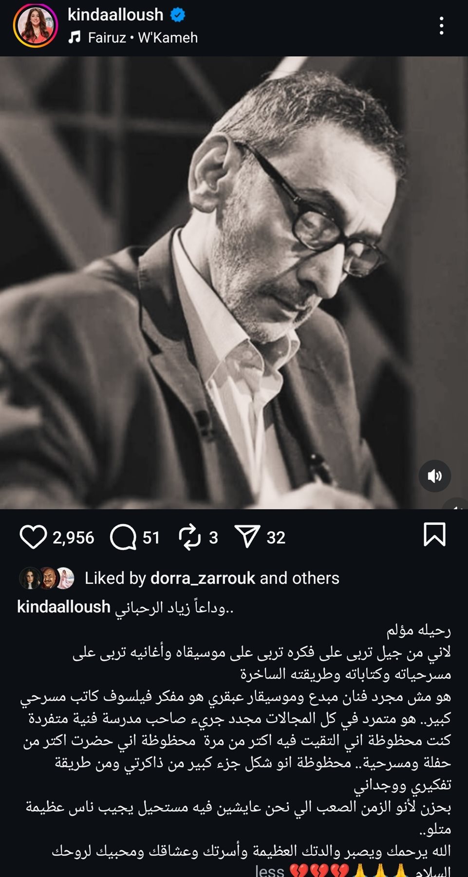 نعت الفنانة كندة علوش، رحيل الفنان والموسيقار الكبير زياد الرحباني في وفاته المنية صباح اليوم عن عمر يناهز 69.