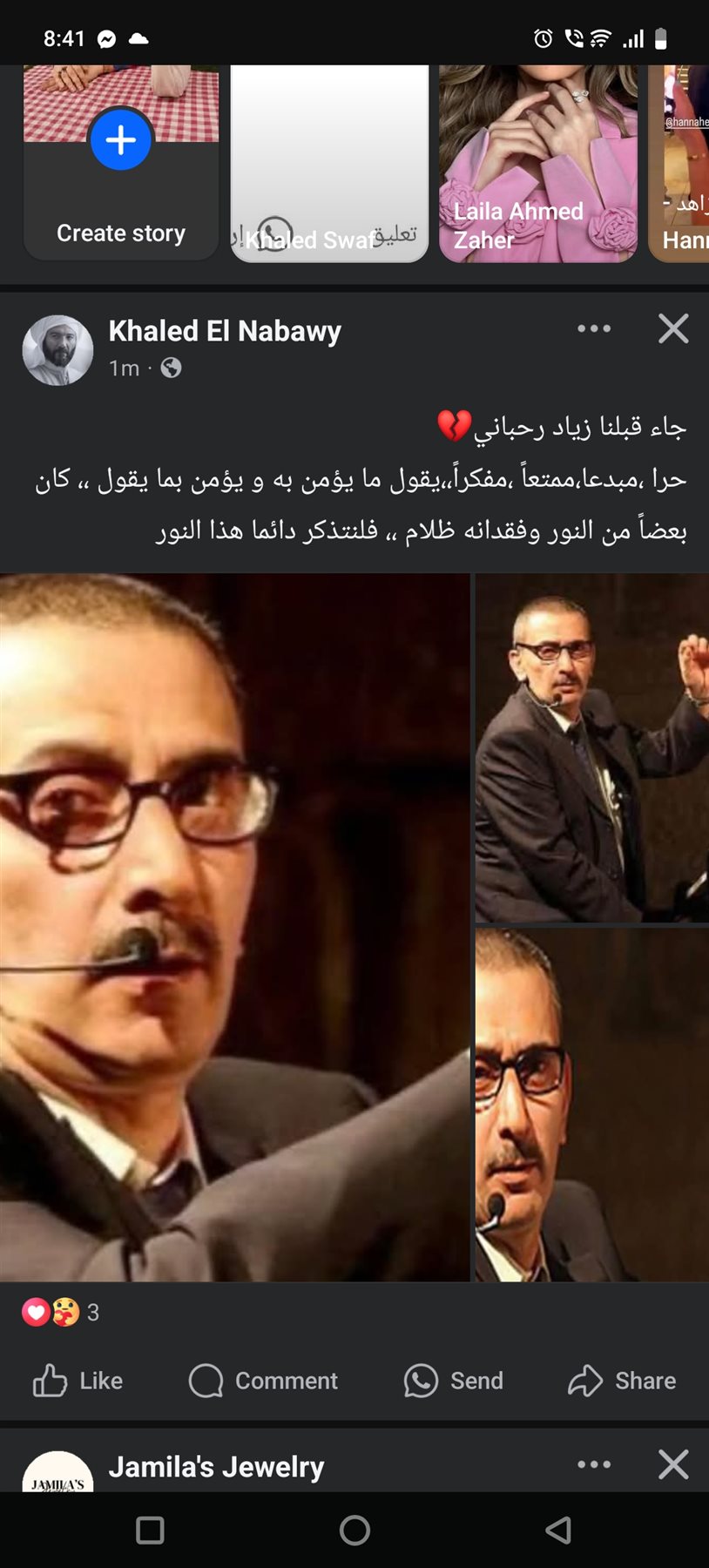 وكتب عبر حسابه الرسمي على موقع التواصل الاجتماعى الفيسبوك: جاء قبلنا زياد رحباني، حرا، مبدعا، ممتعاً، مفكراً، يقول ما يؤمن به ويؤمن بما يقول، كان بعضاً من النور وفقدانه ظلام، فلنتذكر دائما هذا النور.