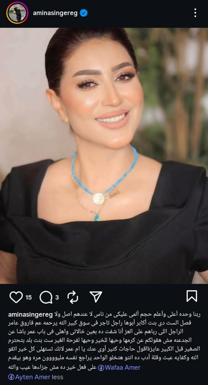 وكتبت عبر حسابها الرسمي على موقع التواصل الاجتماعي لتبادل الصور والفيديوهات الانستجرام: ربنا وحده أعلى وأعلم حجم ألمى عليكى من ناس لا عندهم اصل ولا فصل الست دى بنت أكابر أبوها راجل تاجر في سوق كبير الله يرحمه عم فاروق عامر الراجل اللي رباهم على العز أنا شفت ده بعين خالاتي واهلي في باب عمر.
