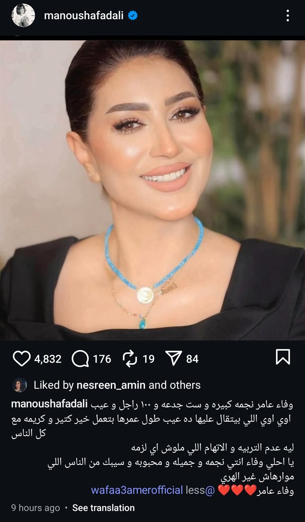 وكتب عبر حسابه الرسمي على موقع التواصل الاجتماعي لتبادل الصور والفيديوهات الانستجرام: وفاء عامر نجمه كبيره وست جدعه و100 راجل و عیب اوي اوي اللي بيتقال عليها ده عيب طول عمرها بتعمل خير كتير و كريمه مع كل الناس.