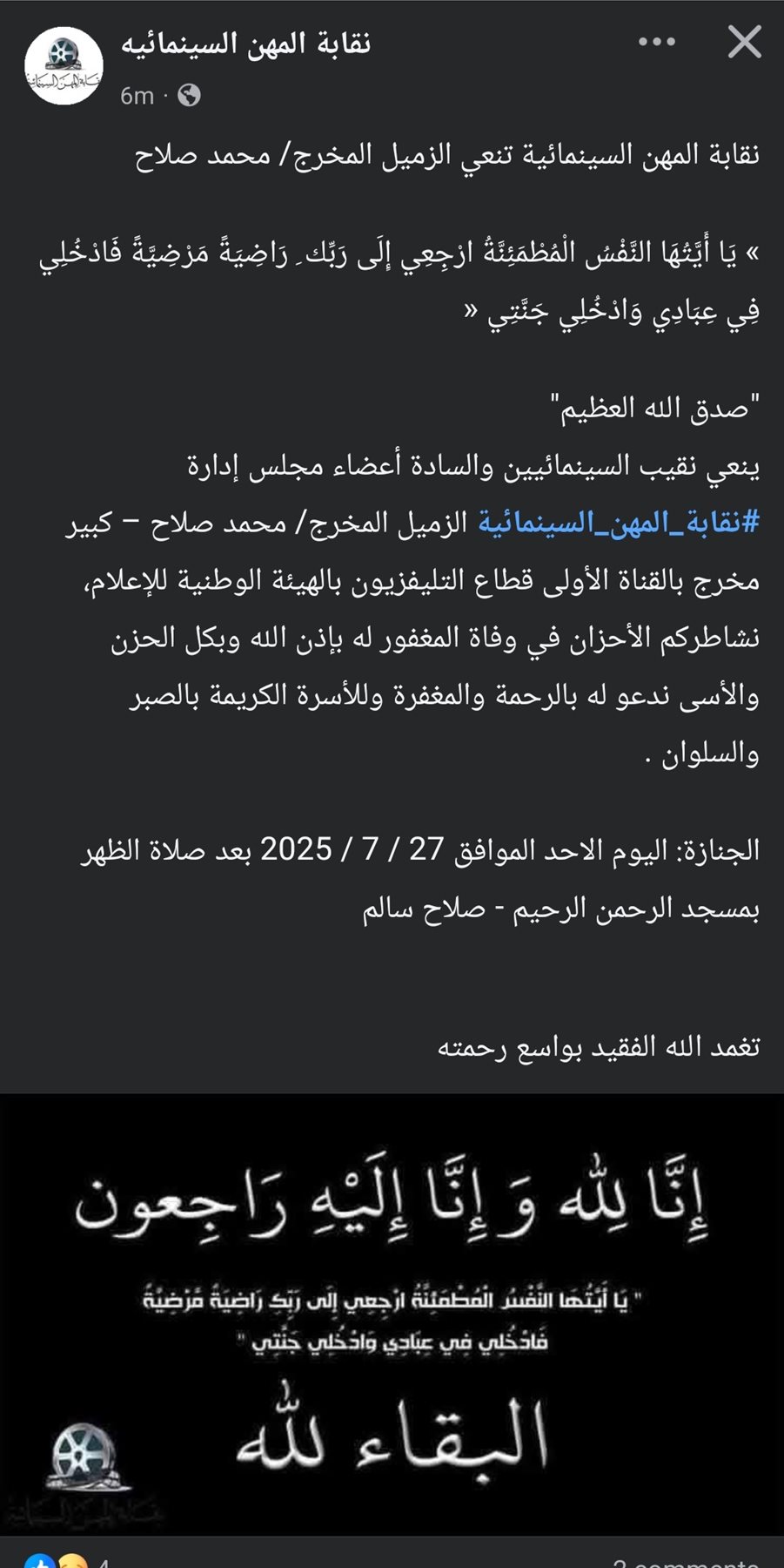 ينعي نقيب السينمائيين والسادة أعضاء مجلس إدارة #نقابة_المهن_السينمائية الزميل المخرج/ محمد صلاح – كبير مخرج بالقناة الأولى قطاع التليفزيون بالهيئة الوطنية للإعلام، نشاطركم الأحزان في وفاة المغفور له بإذن الله وبكل الحزن والأسى ندعو له بالرحمة والمغفرة وللأسرة الكريمة بالصبر والسلوان .