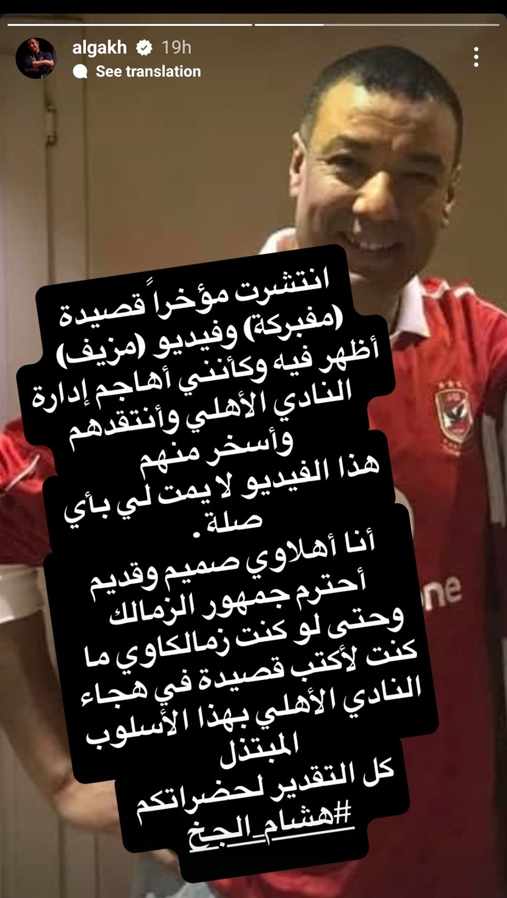 ونشر عبر خاصية الاستوري على حسابه الرسمي على موقع التواصل الاجتماعي لتبادل الصور والفيديوهات الانستجرام: "انتشرت مؤخراً قصيدة (مفبركة) وفيديو (مزيف) أظهر فيه وكأنني أهاجم إدارة النادي الأهلي وأنتقدهم وأسخر منهم هذا الفيديو لا يمت لي بأي صلة".