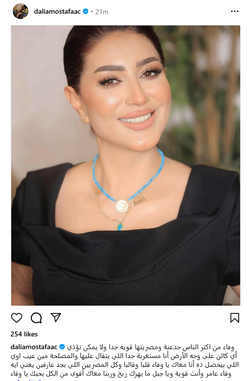 عبرت الفنانة داليا مصطفى عن تضامنها مع الفنانة وفاء عامر بعد تعرضها لحملة هجوم عبر وسائل التواصل الاجتماعي، واتهامها بتجارة الأعضاء.