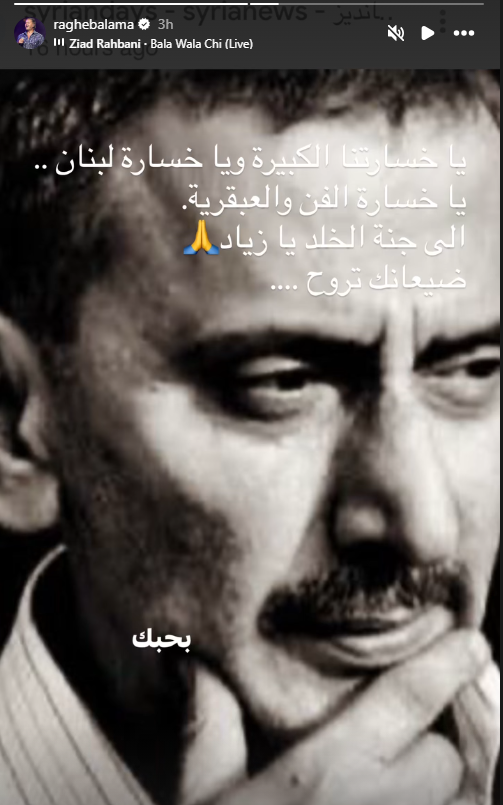 وكتب عبر حسابه الرسمي عبر خاصية الأستوري على موقع التواصل الإجتماعي لتبادل الصور والفيديوهات الانستجرام: يا خسارتنا الكبيرة ويا خسارة لبنان، يا خسارة الفن والعبقرية، الى جنة الخلد يا زياد، ضيعانك تروح.