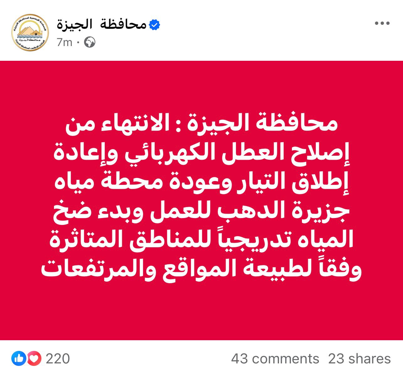حذفت محافظة الجيزة منشور إعلانها عودة الكهرباء والمياه من صفحتها على مواقع التواصل الاجتماعي، وذلك بعد تكذيب الأهالي لهم واستمرارهم فى الشكوى من استمرار انقطاع الكهرباء والمياه.