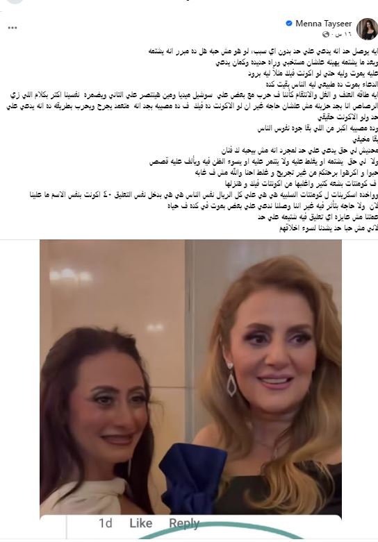واختتمت " وكومنتات بشعة كتير واغلبها من اكونتات فيك و هنزلها وواخده اسكرينات ل كومنتات السلبية هي هي على كل الرجال نفس الناس هي هي بدخل نفس التعليق ٤٠ اكونت بنفس الاسم ما علينا لان ولا حاجه بتأثر فيه غير أننا وصلنا ندعي علي بعض بموت في كده ف حياهعمتنا مش عايزه اي تعليق فيه شتيمه على حد لاني مش حبا حد يشدنا لسوء أخلاقهم ".