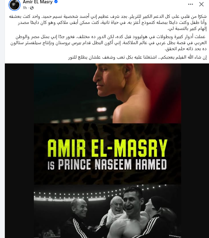 وكتب عبر حسابه الرسمي على موقع التواصل الاجتماعي الفيسبوك: شكرًا من قلبي على كل الدعم الكبير للتريلر، بجد شرف عظيم إني أجسد شخصية نسيم حميد، واحد كنت بعشقه وأنا طفل وكنت دايمًا ببصله كنموذج أعتز به. في حياة تانية، كنت ممكن أبقى ملاكم، وهو كان دايمًا مصدر إلهام كبير بالنسبة لي.