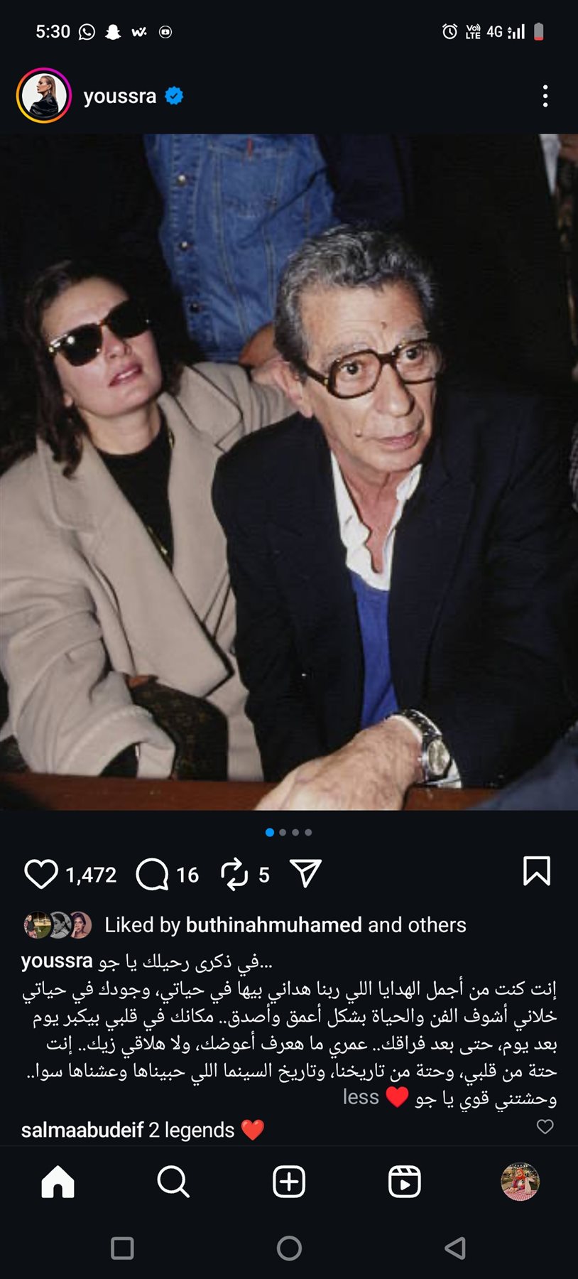 وتابعت: مكانك في قلبي بيكبر يوم بعد يوم، حتى بعد فراقك.. عمري ما هعرف أعوضك، ولا هلاقي زيك.. إنت حتة من قلبي، وحتة من تاريخنا، وتاريخ السينما اللي حبيناها وعشناها سوا... وحشتني قوي يا جو.