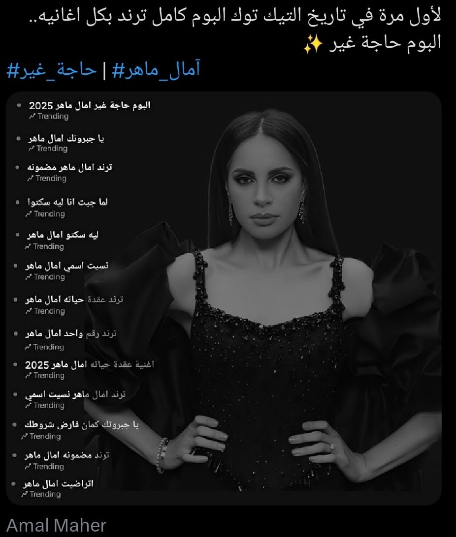 تصدر ألبوم النجمة آمال ماهر الجديد الذى يحمل إسم "حاجة غير" قائمة التريند على منصة "تيك توك"، وذلك بجميع أغانيه، في سابقة هي الأولى من نوعها في تاريخ المنصة، وحقق الألبوم تفاعلاً واسعاً بين المستخدمين، حيث استخدمت مقاطع الأغاني في آلاف الفيديوهات، مما يعكس جماهيرية آمال ماهر الكبيرة ونجاحها في العودة القوية إلى الساحة الفنية.
