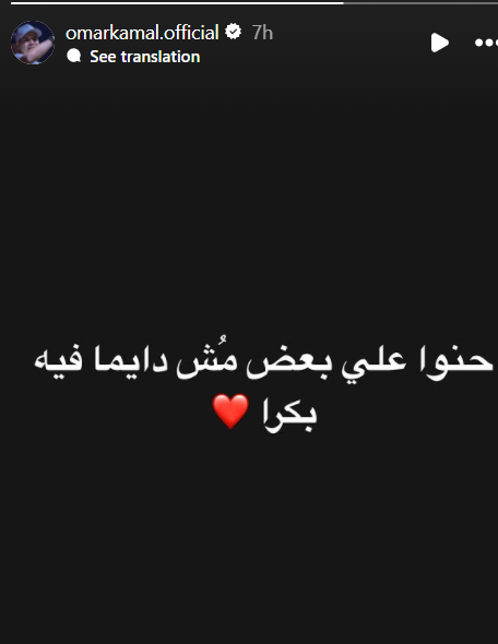 وكتب عمر كمال عبر خاصية الأستوري على حسابه الرسمي على موقع التواصل الاجتماعي لتبادل الصور والفيديوهات الانستجرام: حنوا علي بعض مش دايما في بكرة.