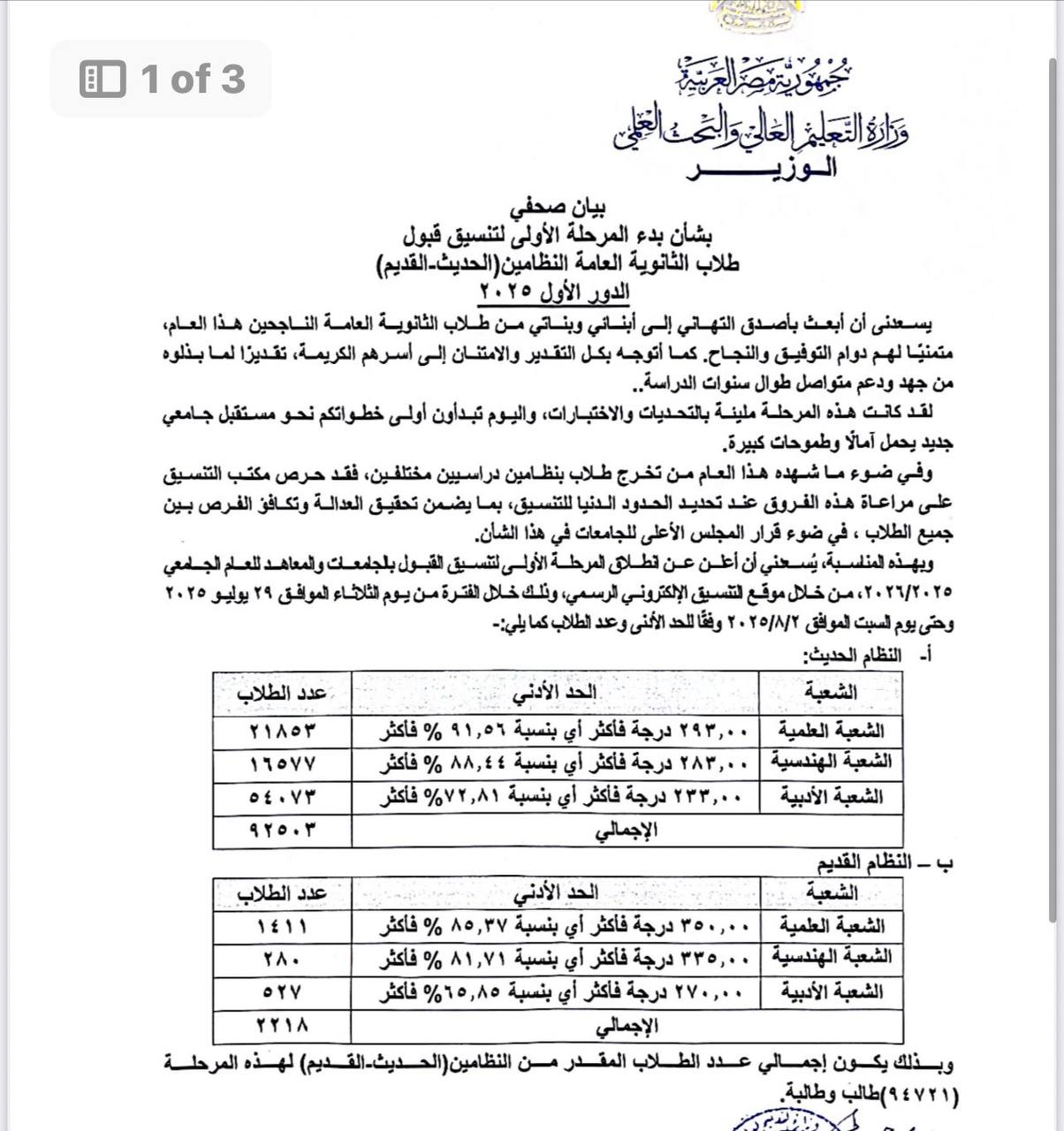 الحد الادنى للمرحلة الاولى 2025….كشف مكتب تنسيق القبول بالجامعات عن الحد الأدنى للمرحلة الأولى من تنسيق الجامعات للعام الجامعي 2025/2026، والذي شهد ارتفاعًا ملحوظًا في درجات القبول مقارنة بالعام الماضي 2024، مما يعكس زيادة في شرائح المجاميع المرتفعة بين طلاب الثانوية العامة لهذا العام.