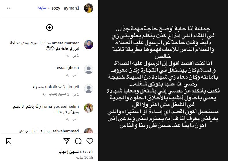 ونشرت سوزي توضيح عبر صفحتها الرسمية "إنستجرام" قائلة " "جماعة أنا حابة أوضح حاجة مهمة جدا.. في اللقاء اللي اتذاع كنت بتكلم بعفويتي زي دايما وقلت حاجة عن الرسول عليه الصلاة والسلام الناس للأسف فهموها بطريقة تانية خالص.. أنا كنت أقصد أقول إن الرسول عليه الصلاة والسلام كان بيشتغل في التجارة وكان معروف بأمانته وكان معاه زي شهادة من السيدة خديجة بتوثق شغله فكنت بتكلم عن نفسي إني بشتغل ومعايا شهادة يعني بحاول أتشبه بالأخلاق الحلوة والجدية في الشغل مش أكتر ولا أقل.