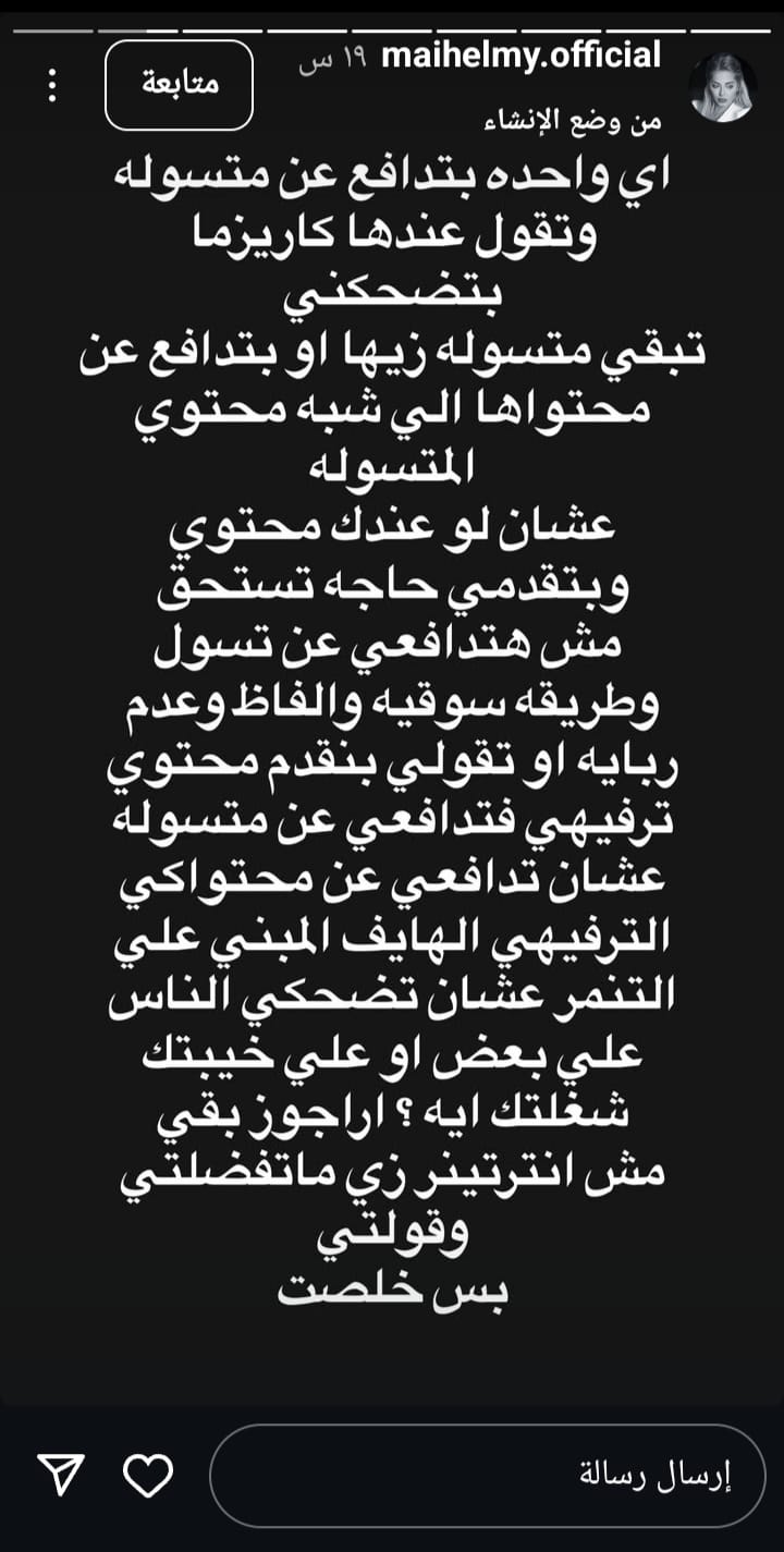 كتبت مي حلمي من خلال حسابها الرسمي عبر موقع تبادل الصور والفيديوهات القصيرة "إنسجرام"، عبر خاصية استوري، قالت “ أي واحدة بتدافع عن متسولة ، وتقول عندها كاريزما بتضحكني ، تبقى متسولة زيها او بتدافع عن محتواها الي شبه محتوى المتسولة".