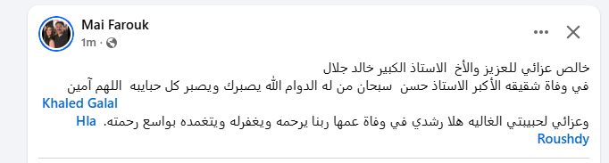 وكتبت عبر حسابها الرسمي على موقع التواصل الاجتماعي الفيسبوك: "خالص عزائي للعزيز والأخ الأستاذ الكبير خالد جلال، في وفاة شقيقه الأكبر الأستاذ حسن سبحان من له الدوام الله يصبرك ويصبر كل حبايبه اللهم آمين، وعزائي لحبيبتي الغاليه هلا رشدي في وفاة عمها ربنا يرحمه ويغفرله ويتغمده بواسع رحمته".