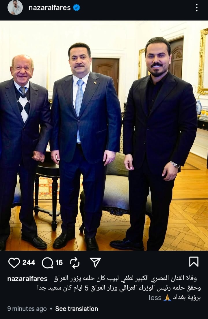 ونشر نزار صورة تجمعه بالفنان الراحل ورئيس الوزراء العراقي عبر صفحته الرسمية "إنستجرام" وكتب "وفاة الفنان المصري لطفي لبيب كان حلمه يزور العراق وحقق حلمه رئيس الوزراء العراق 5 أيام كان سعيد جدا برؤية بغداد ".