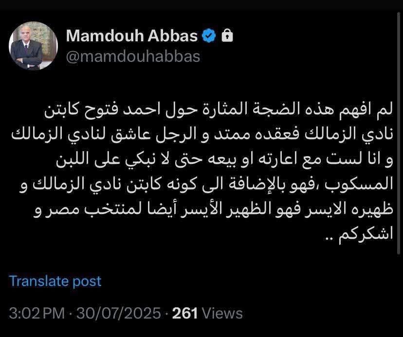 ونشر عباس عبر حسابه على منصة "إكس" (تويتر سابقًا):"لم أفهم سبب الضجة المثارة حول أحمد فتوح، كابتن نادي الزمالك. عقده لا يزال ساريًا، وهو لاعب مُحب ومخلص للنادي. أعارض تمامًا فكرة بيعه أو إعارته، حتى لا نندم لاحقًا، فهو ليس فقط ظهيرًا أيسرًا مميزًا للزمالك، بل أيضًا لمنتخب مصر. أشكركم."