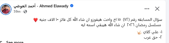وكتب أحمد العوضي عبر حسابه الرسمي على موقع التواصل الاجتماعي الفيسبوك:"سؤال المسابقة رقم (٧٢).. ١٥ أخ وأخت هيفوزوا إن شاء الله، كل فايز ,10 آلاف جنيه، مسلسل رمضان ٢٠٢٦ إن شاء الله هيبقى اسمه إيه؟"