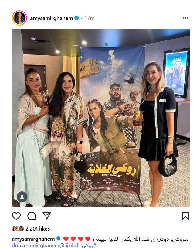 حرصت الفنانة إيمي سمير غانم، على تقديم الدعم لشقيقتها دنيا سمير غانم من خلال مشاركتها العرض الخاص لفيلمها روكي الغلابة، في إحدى المولات.