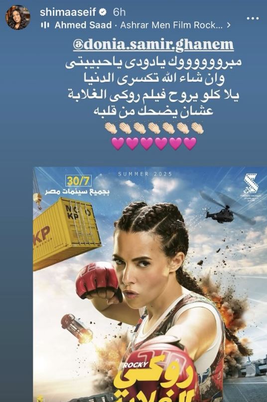 وكتبت شيماء سيف عبر خاصية الاستوري علي صفحتها الرسمية "إنستجرام" مبروك يا دودي يا حببتي ،إن شاء الله تكسري الدنيا ، يلا كلو يروح فيلم روكي الغلابة علشان يضحك من قلبه".