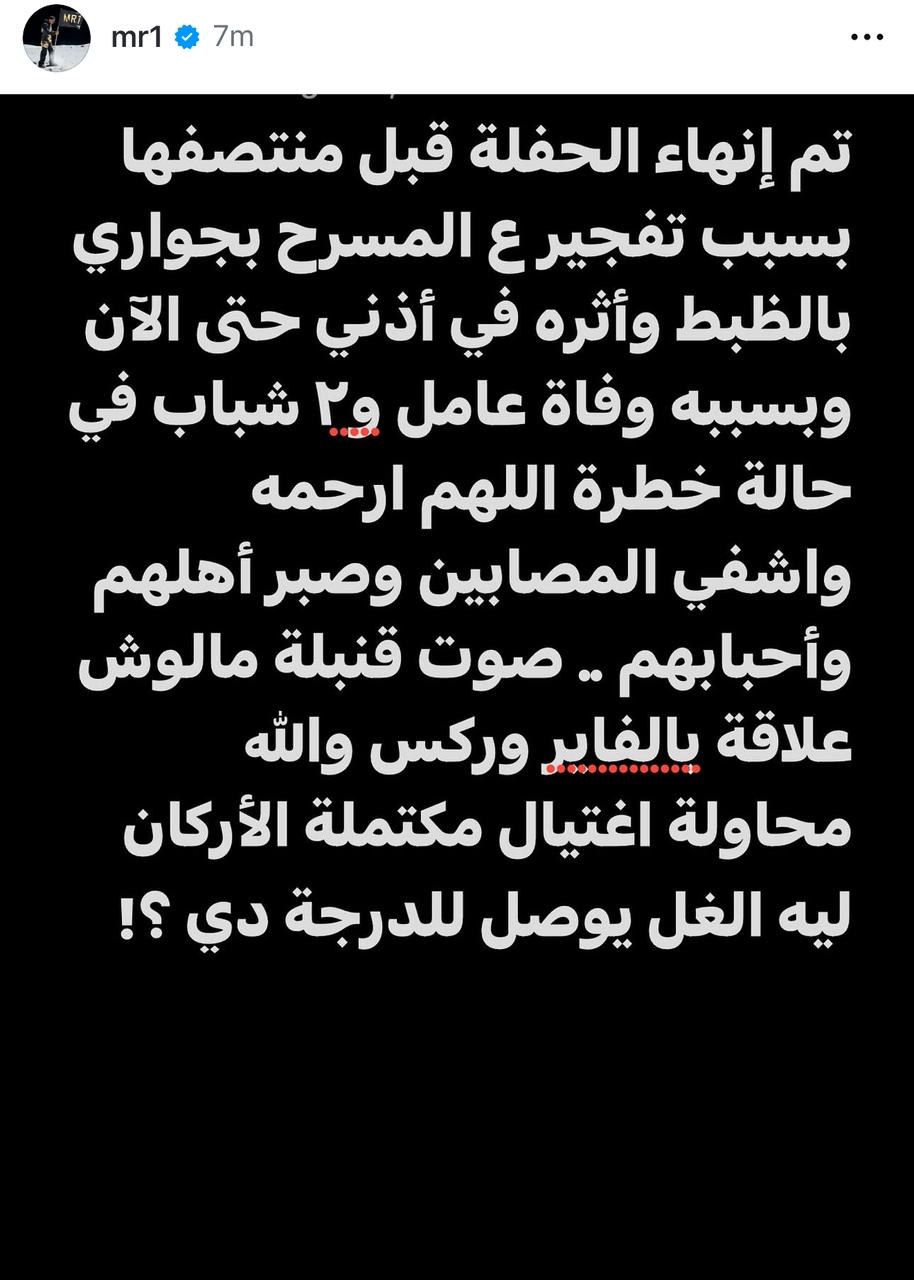 وأثار المنشور تفاعلًا واسعًا، قبل أن يقوم الفنان بحذفه لاحقًا، دون توضيح رسمي لأسباب الحذف حتى الآن، في حين تواصل الجهات المختصة تحقيقاتها للوقوف على ملابسات الحادث واتخاذ الإجراءات اللازمة بشأن تنظيم الحفل وسلامة الحضور.