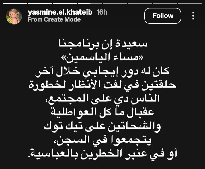 وكتبت الخطيب عبر ستوري على صفحته الرسمية "إنستجرام" " سعيدة إن برنامجنا مساء الياسمين كان له دور إيجابي خلال آخر حلقتين في لفت الأنظار لخطورة الناس دي على المجتمع ".