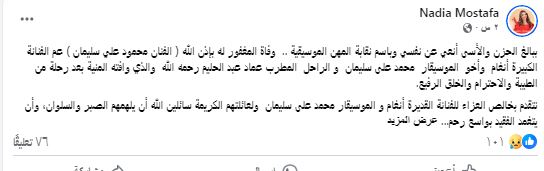 نعت الفنانة نادية مصطفي عم المطربة أنغام الذي توفي داخل شقته منذ عدة أيام وكتبت عبر صفحتها الرسمية على موقع "فيس بوك" " ببالغ الحزن والأسى أنعى عن نفسي وباسم نقابة المهن الموسيقية .. وفاة المغفور له بإذن الله ( الفنان محمود علي سليمان ) عم الفنانة الكبيرة أنغام وأخو الموسيقار محمد على سليمان و الراحل المطرب عماد عبد الحليم رحمه الله والذي وافته المنية بعد رحلة من الطيبة والاحترام والخلق الرفيع".